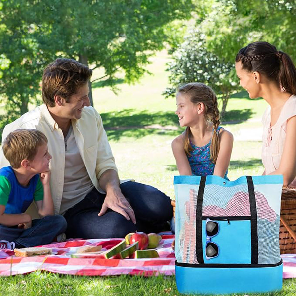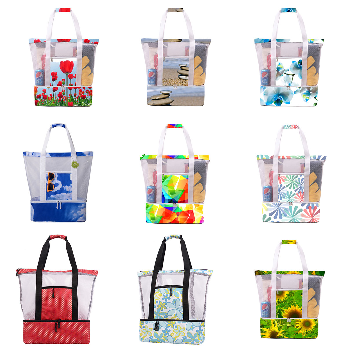 Beach Bag, Mesh Beach Bag with Cooler, Compartment for Women Beach Vacation Essentials. Made with strong lightweight mesh material that won’t break or tear easily from normal use and wear; we used the best in class fabric; Featuring an additional insulated cooler bag section with an easy to clean flexible soft liner, perfect for keeping your food and drinks cool and fresh. This picnic lunch cooler bags attribute makes the bag a must for any parent. Come with extra detachable adjustable shoulder straps for comfort and easily fits anybody type. In construction with padded, reinforced handles for comfort and a shoulder drop, this tote bag is perfect for the beach, cruise, pool, parks, picnics, BBQ’s, camping, road trips, vacations, festivals, travel tote. Customizable.